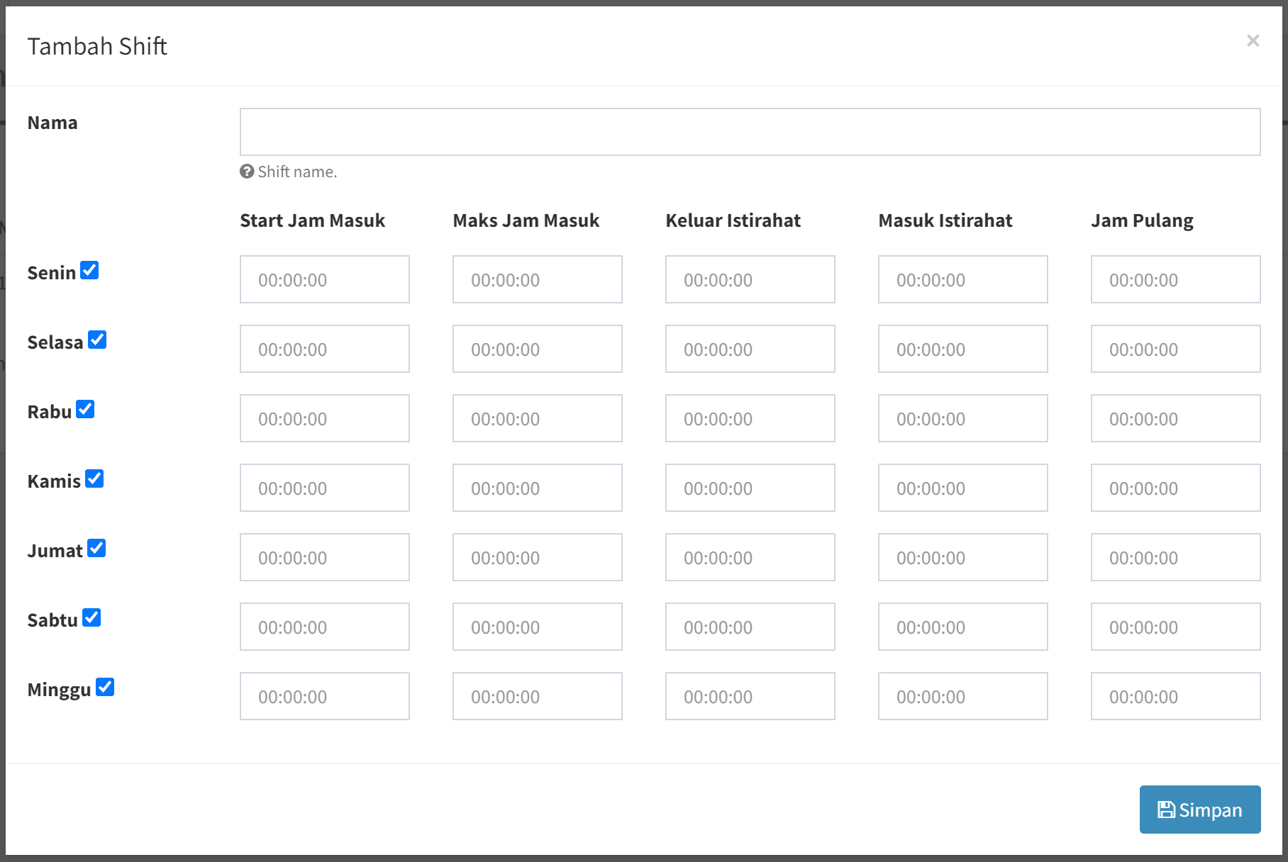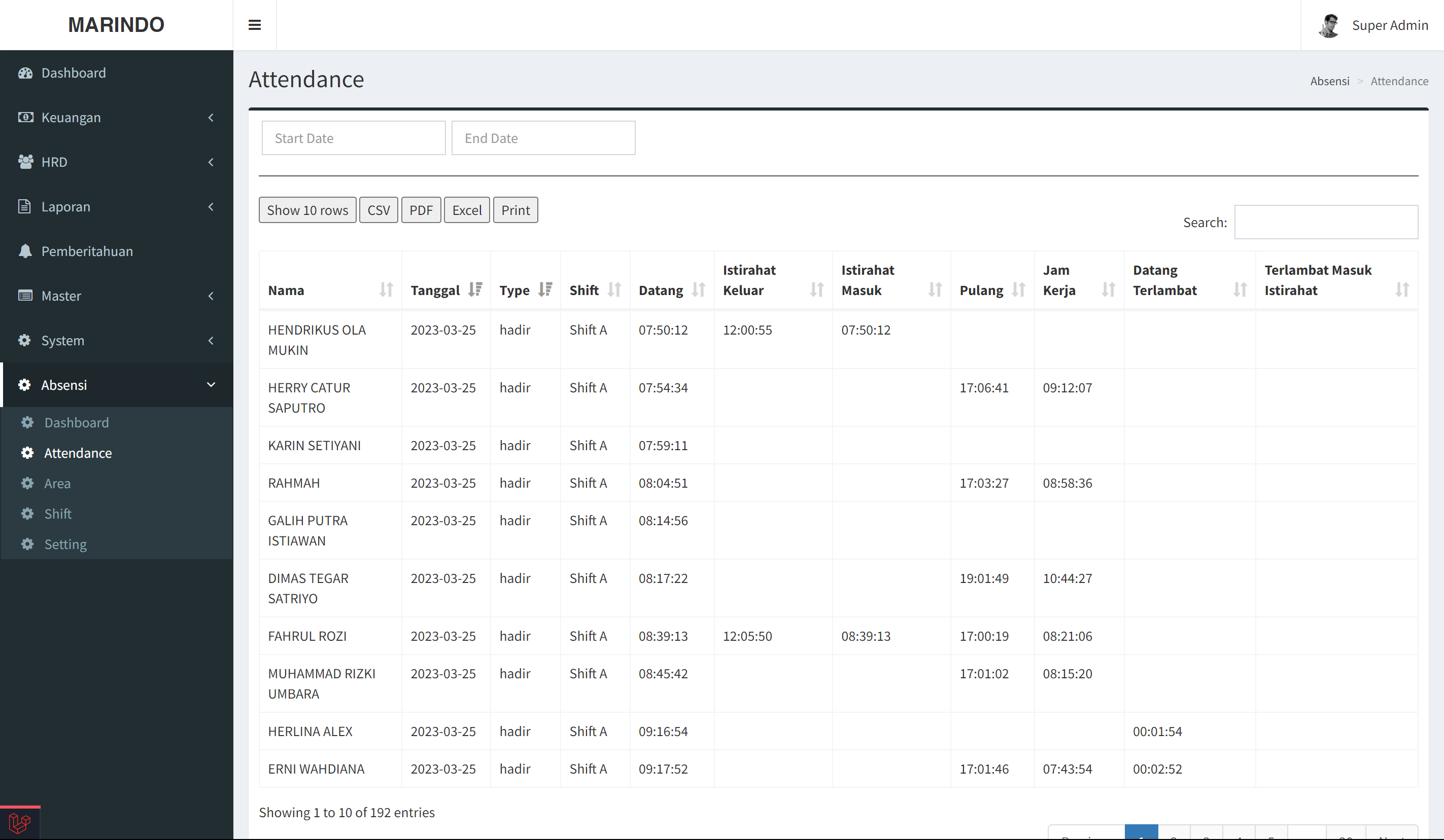 Nama, Tanggal, Type, Shift, Datang, Istirahat Keluar, Istirahat Masuk, Pulang, Jam Kerja, Datang Terlambat, Terlambat Masuk IstirahatPada halaman attedance admin juga bisa mengexport data attendance yang ada ke