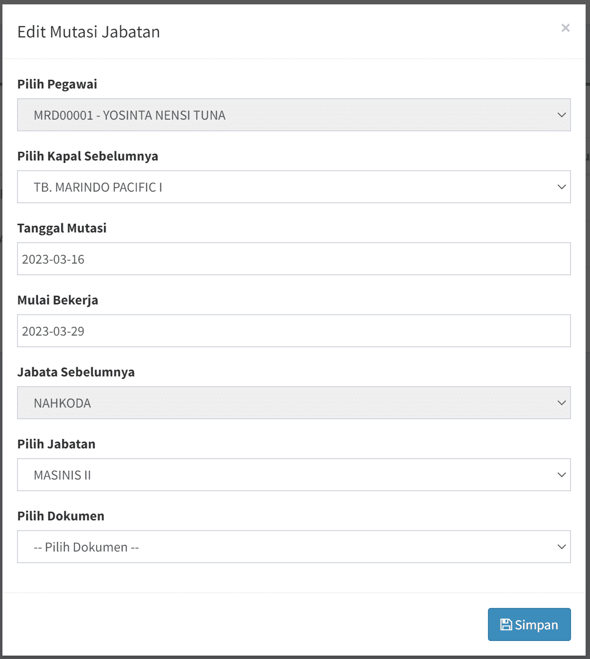 Pilih Jenis Mutasi Jabatan atau Kapal, Pilih Pegawai, Pilih Kapal Sebelumnya (Otomatis memasukkan data Kapal Sebelumnya), Pilih Kapal, Tanggal Mutasi, Mulai Bekerja, Jabatan Sebelumnya (Otomatis memasukkan data Jabatan Sebelumnya), Pilih Jabatan, dan Pilih Dokumen Pendukungdan tekan tombol Simpan -