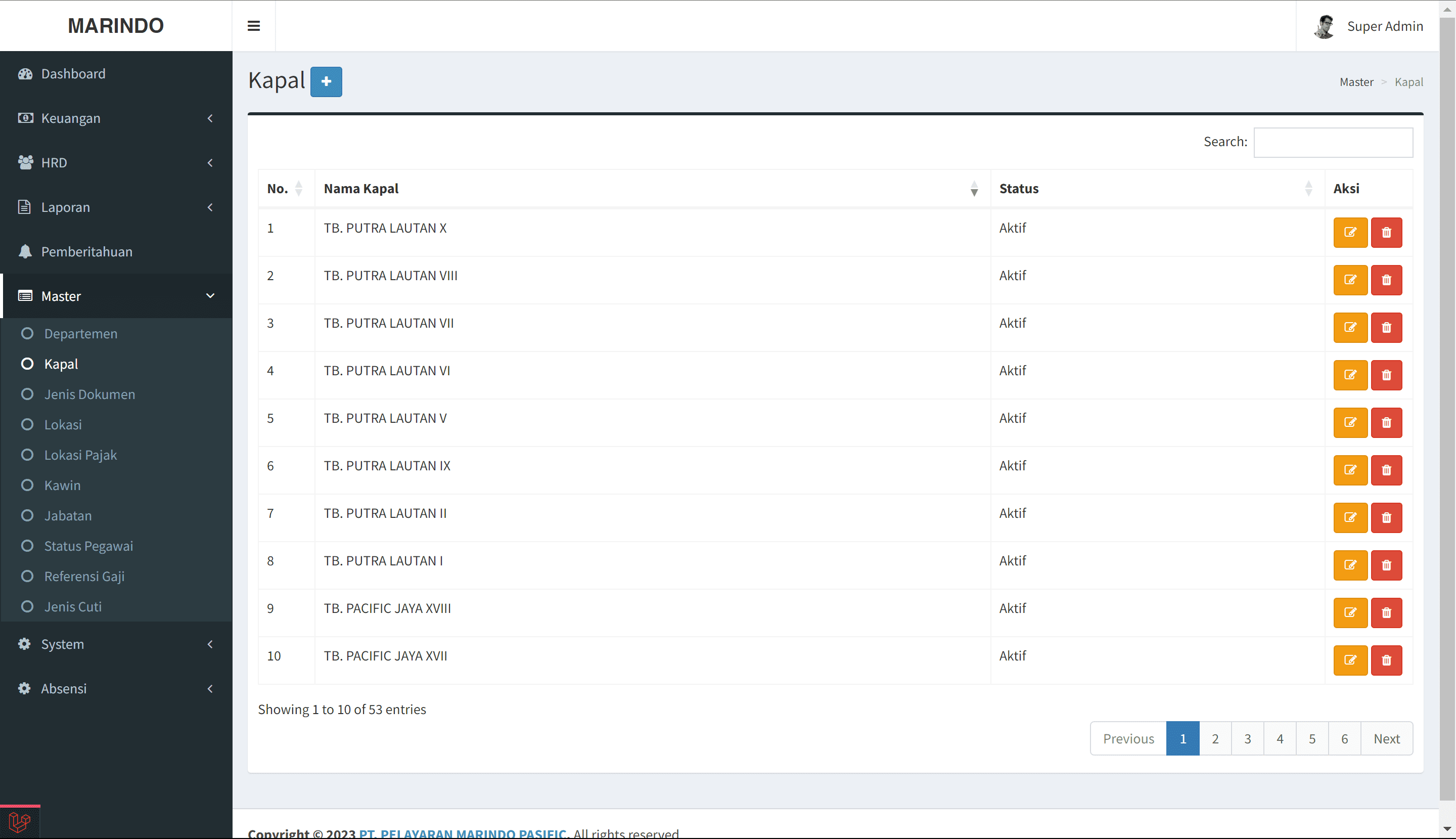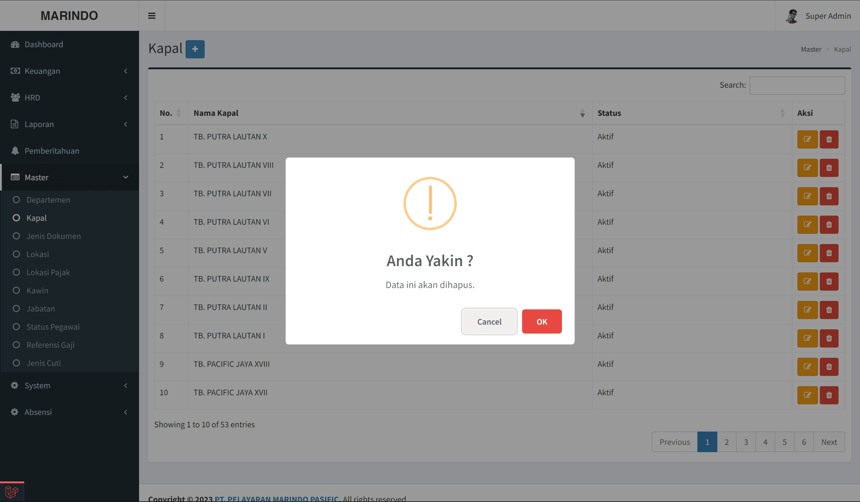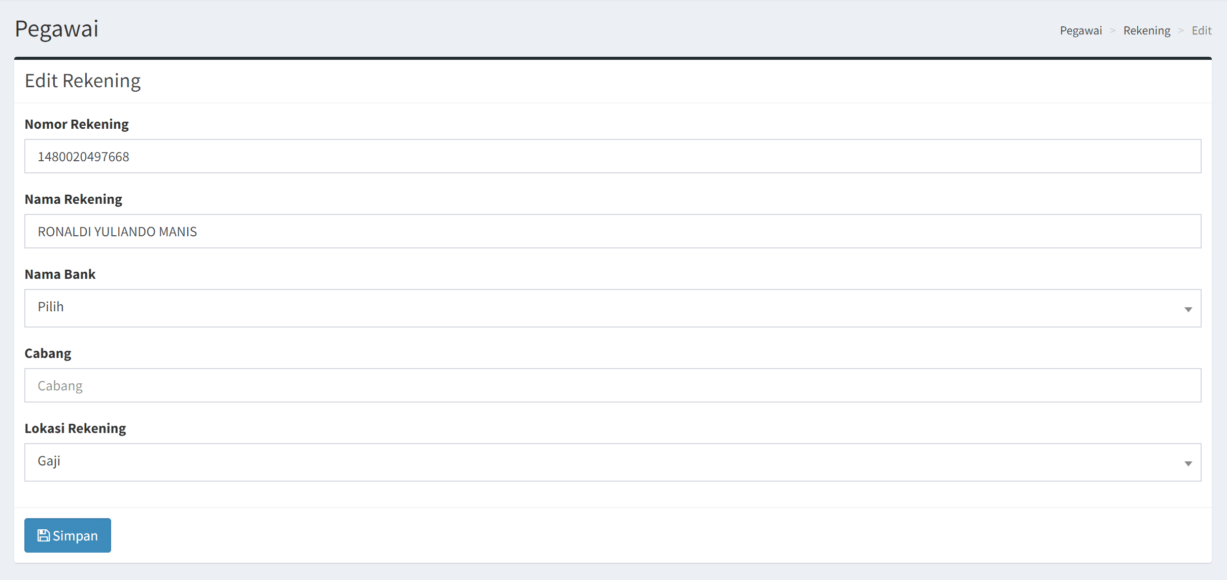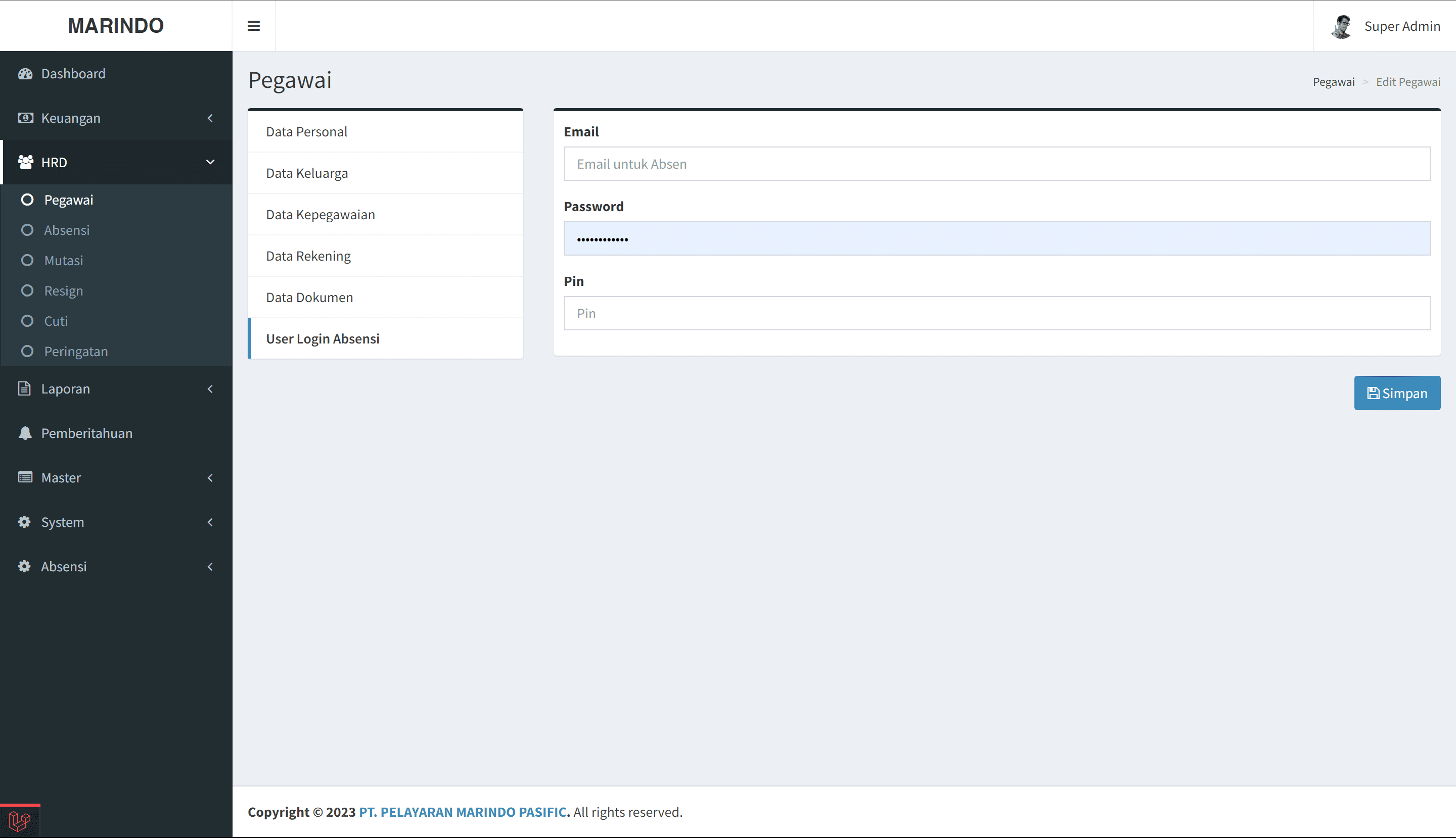 Tanggal Masuk (Sudah tidak dapat dirubah), NIP (Sudah tidak dapat dirubah), NPWP, Keahlian Dasar, Pendidikan Terkahir, Lokasi Kerja Pegawai, Pilih Kapal, Departemen, Jabatan, Status Kepegawaian, Status Kawin, Lokasi Pajak, Status Pegawai, Tanggal Keluar (Data ter isi apabila karyawan resign), dan memilih berbagai fasilitas untuk karyawan (BPJS, JKK, JKM, JHT, IP)dan tekan tombol Simpan