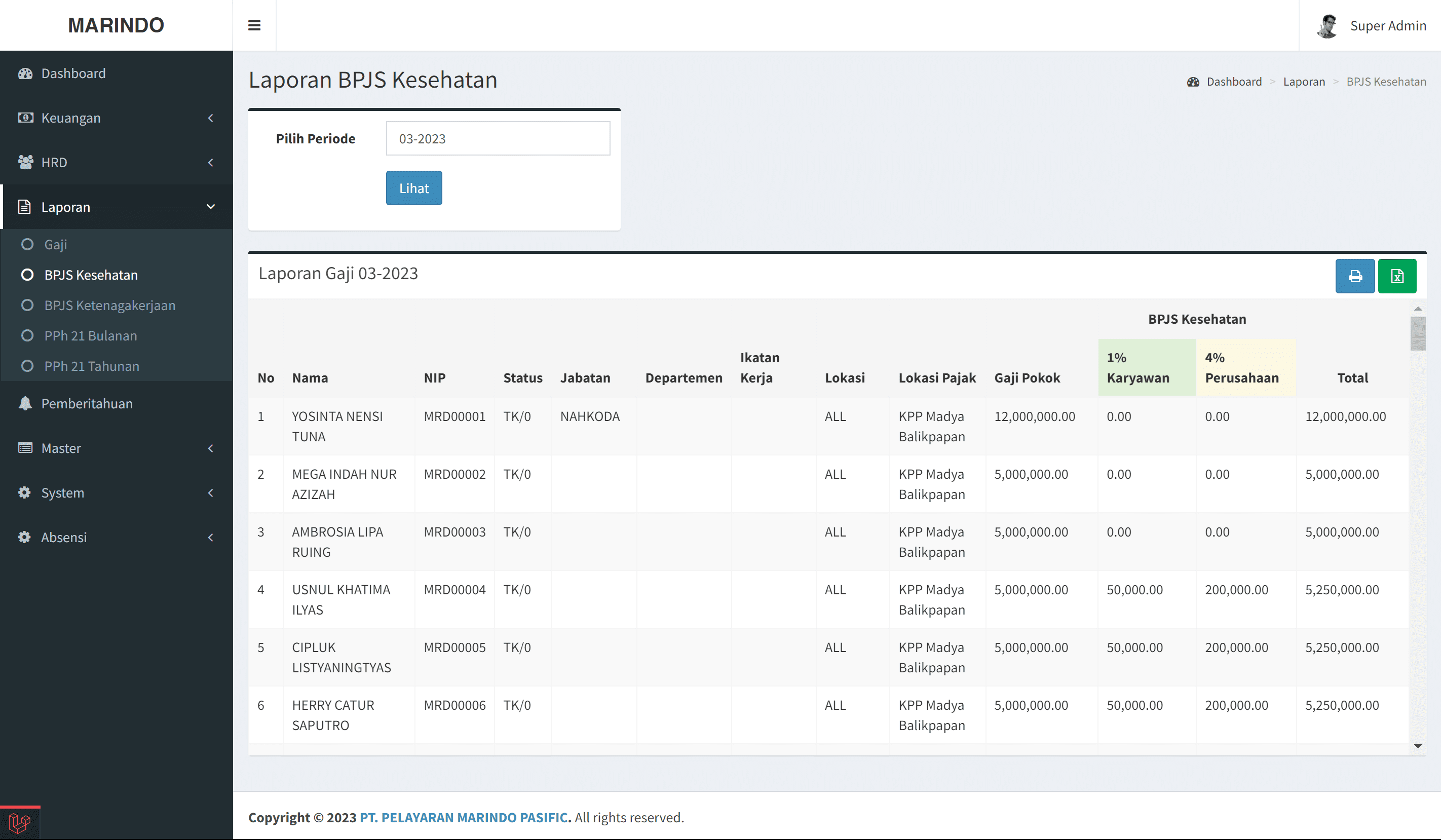 Setelah memilih periode bpjs ketenagakerjaan yang ingin ditampilkan maka akan muncul data keseluruhan bpjs ketenagakerjaan pada periode tersebut. Pada detail bpjs ketenagakerjaan ini anda bisa mencetak atau mendownload file excel dari laporan BPJS Ketenagakerjaan tersebut.
