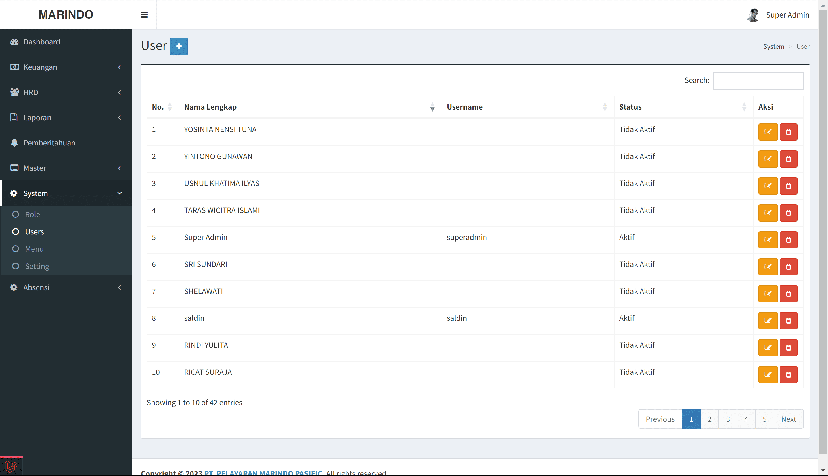 Data pengaturan absensi untuk MARINDO PAYROLL